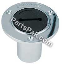 DECK PLATES FOR HOSE are chrome plated zinc with black plastic cap. Complete with key, O-ring and retaining cable on cap. Cap has slot between holes. Screw size is 8. Neck legnth measures 2-1/2". OD flange is 3-1/2". Hose size is 1-1/2". Gas deck plate meets requirements of USCG safety standards, January 31,1977 for gasoline fuel systems, 33CFR183. Use spare O-ring 513008 and spare key 1248008ZNC.