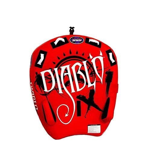 Rave Diablo 2 Person 56in Towable Tube 2011 - The Diablo D shape tube by Rave is as hot as they come for stability and high speed water action! With built in centrifugal force deterrents, riders are kept in place by the perimeter inflated sponsons at the rear meaning fewer stops to pick up riders and overall less fuel consumed. Soft-Grip foam filled handles with foam knuckle guards help hands stay connected with no irritation. Should a rider spill, the tapered design makes for easy deep water boarding while providing plenty of flotation up front where it is needed. Unique thrill-seeker graphics set these tubes apart from any thing else on the water. . Warranty: One Year, Special Features: Quick connect tow point, Material: 420D durable nylon, Number of Riders: 2, Size: 12 Inches High x 48 Inches Wide x 56 Inches Long, Number of Economy Valves: 2, Number of Boston Valves: 1, Sets of Handles: 2 Sets, Covered?: Yes, Model Year: 2011, Product ID: 160967